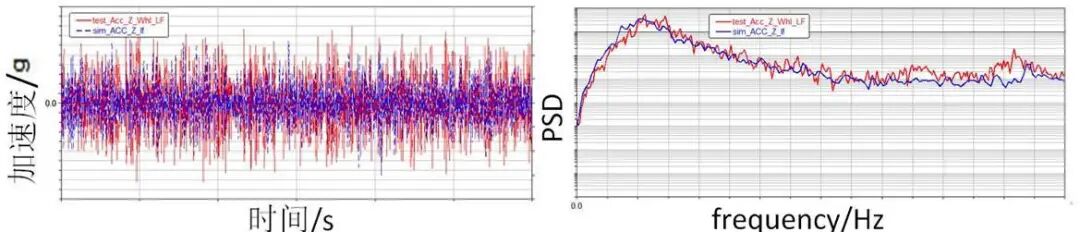 由下图7试验与仿真的结果对比可以看到,仿真与试验的加速度时域与PSD一致性趋势较好。经过振动疲劳仿真验证,该加速度可以很好的复现车身的振动疲劳问题。